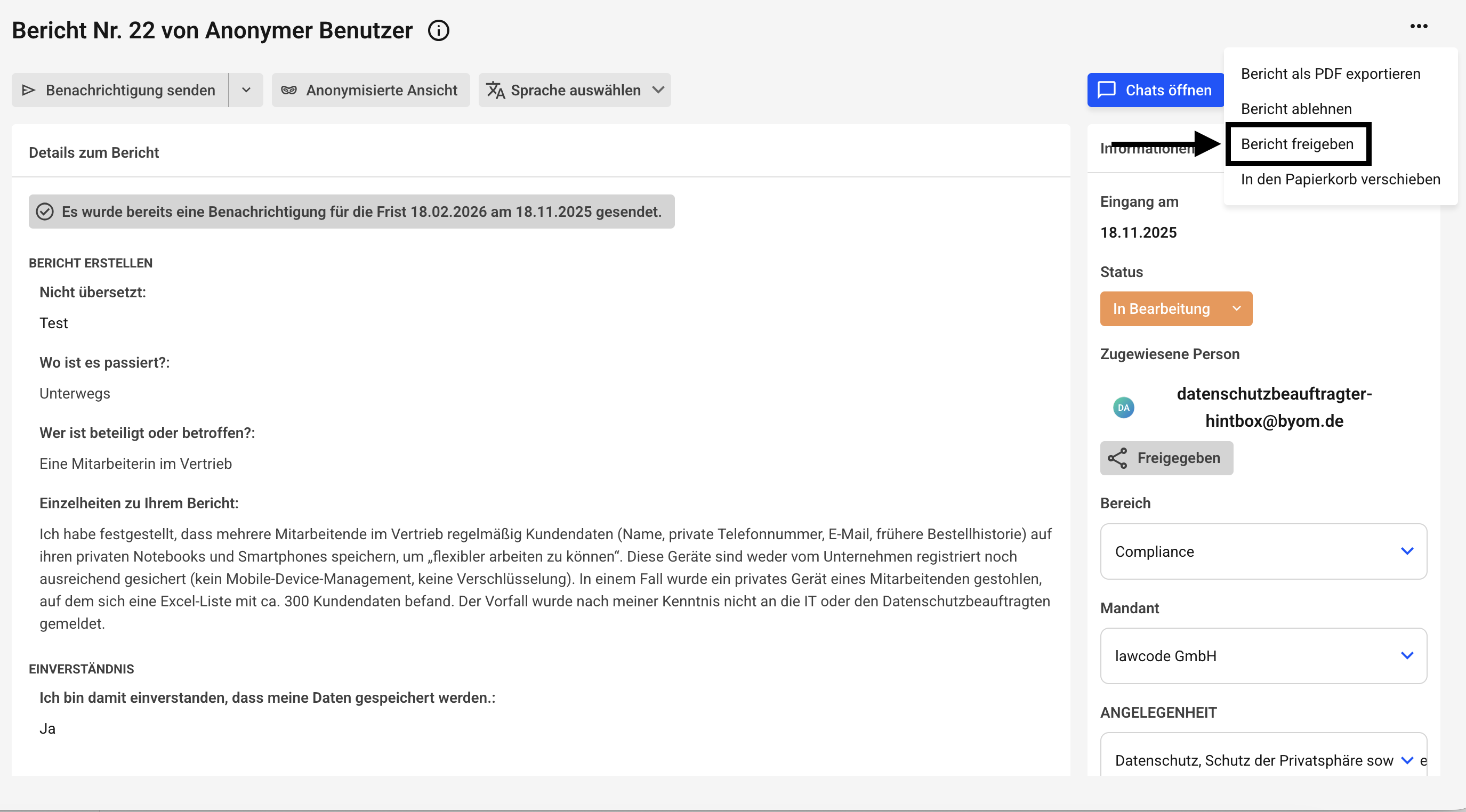 In diesem Kapitel wird ihnen erklärt, wie Sie eine bestehende Hinweisfreigabe eines Fallbearbeiters mit der Rolle "Leser" entfernen können.
