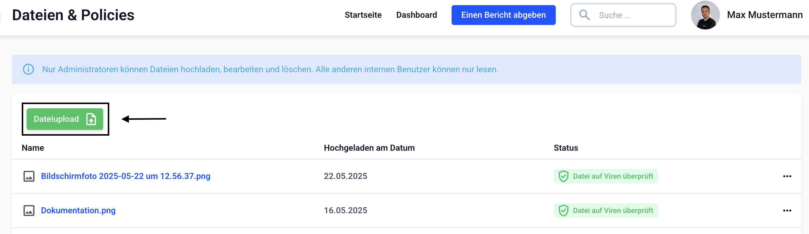 Wie kann ich eine Datei bei Dateien & Policies hochladen?