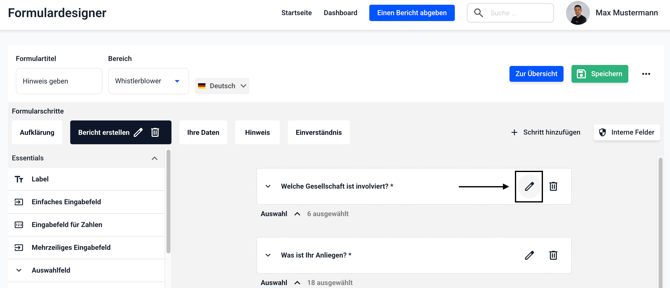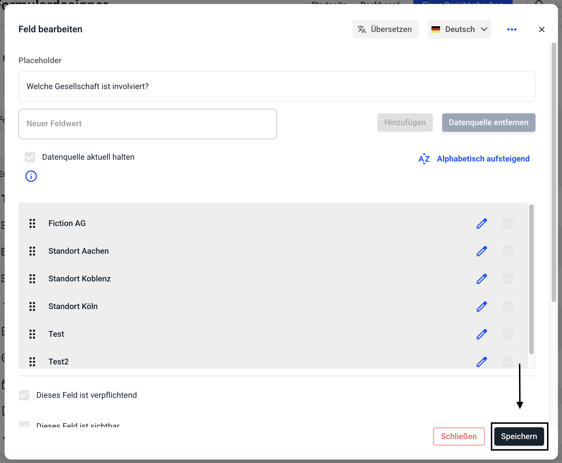 Klicken Sie auf Speichern, um die Veränderung im Formular zu speichern.