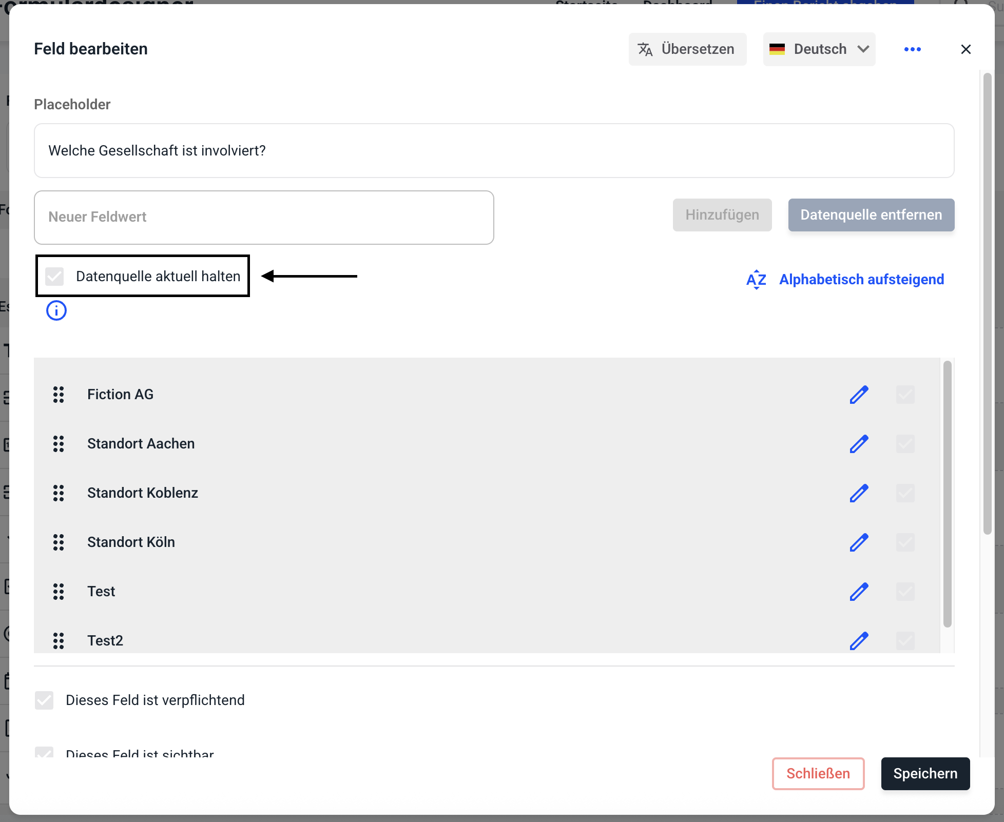 Klicken Sie die Checkbox Datenquelle aktuell halten an, um festzulegen, dass neu zur Datenquelle hinzugefügte Elemente automatisch im Status 'aktiv' oder 'inaktiv' ins Auswahlfeld übernommen werden.