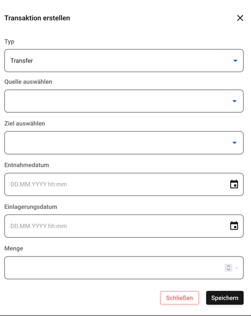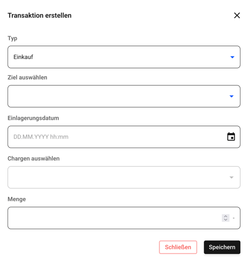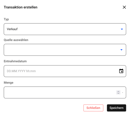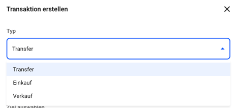 Es öffnet sich ein neuer Dialog, in dem Sie zunächst den Typ der Transaktion festlegen sollten. Der Dialog sieht je nach Transaktionstyp unterschiedlich aus. Wählen Sie den Transaktionstypen in dem Drop Down Menü der ersten Zeile aus.