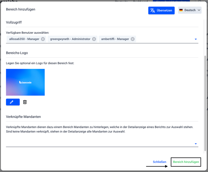 Wenn Sie alle Informationen eingetragen haben, klicken Sie auf Bereich hinzufügen. Sollten Sie in Ihrer Hintbox mehr Sprachen anbieten, klicken Sie vorher auf Übersetzen.