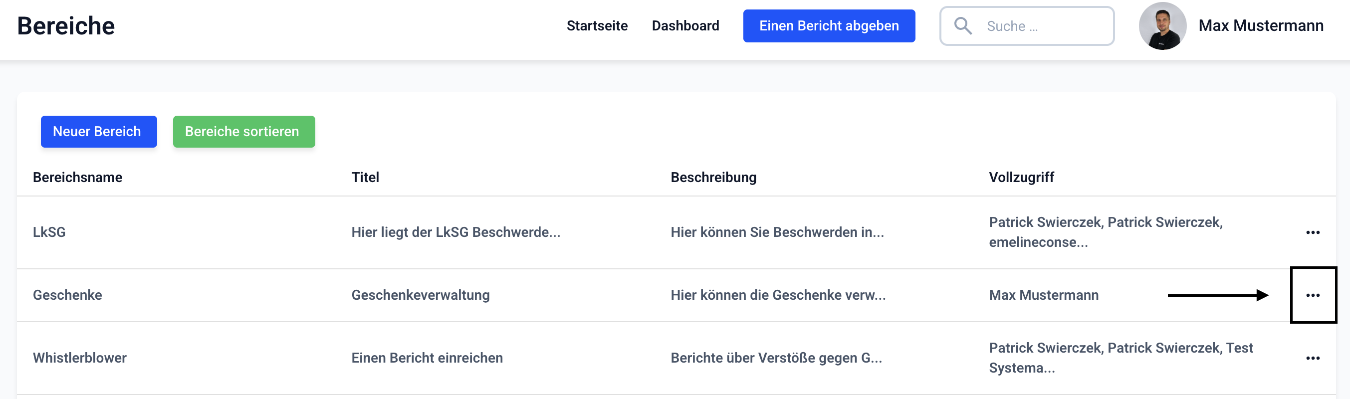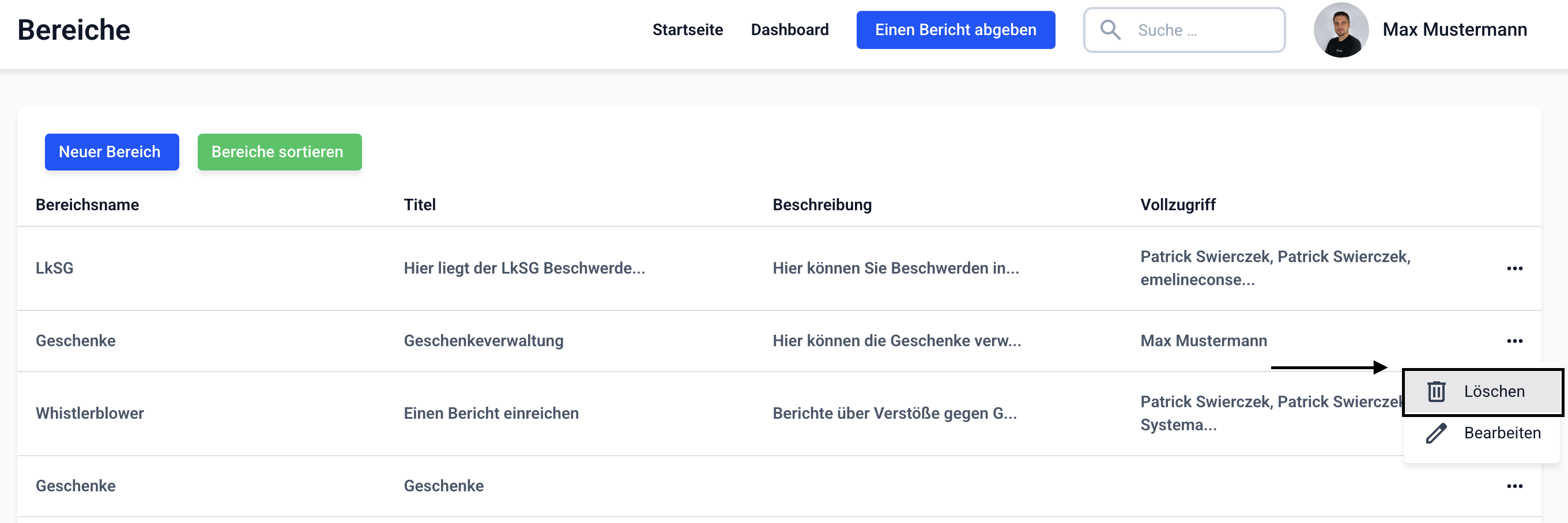 Bereiche können gelöscht werden. Navigieren Sie dafür in die Formularverwaltung.
