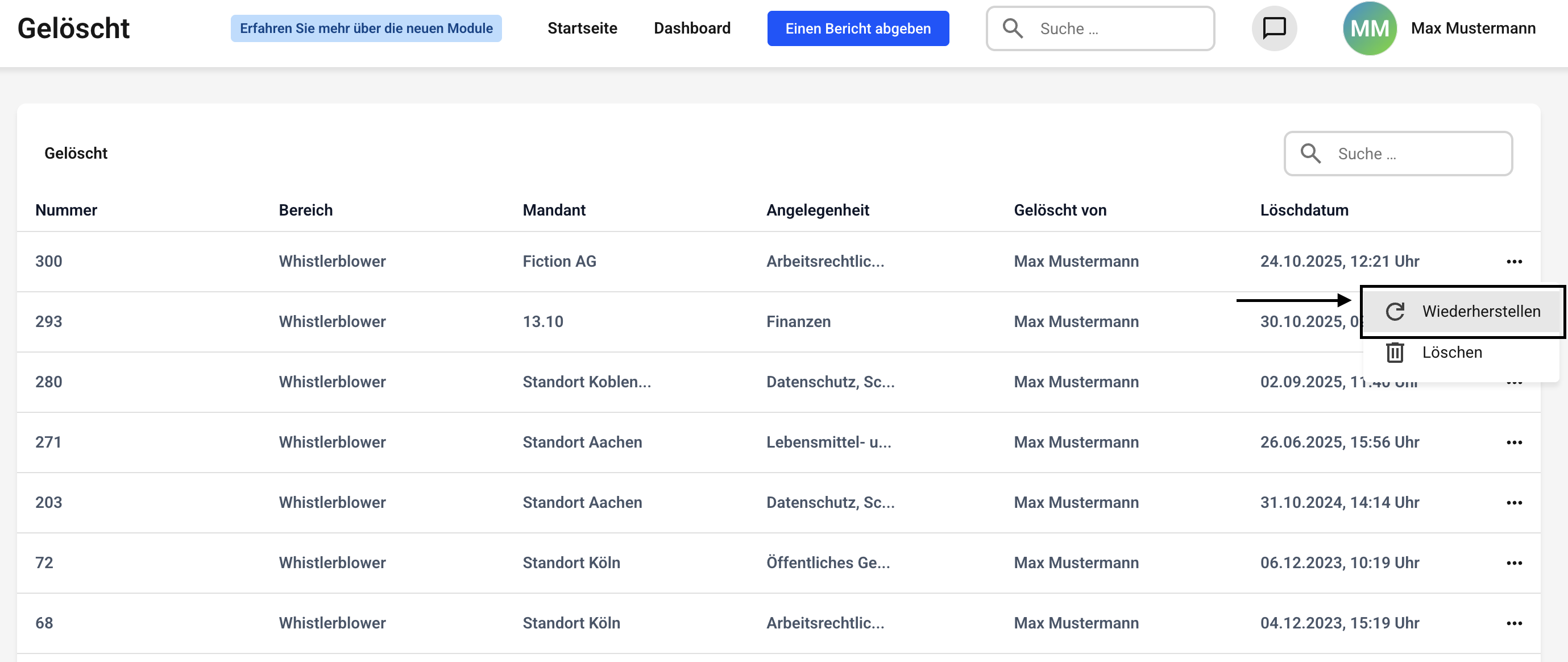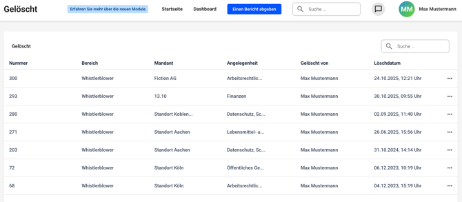 Sie erhalten eine ausführliche Übersicht über die in den Papierkorb verschobenen Berichte.