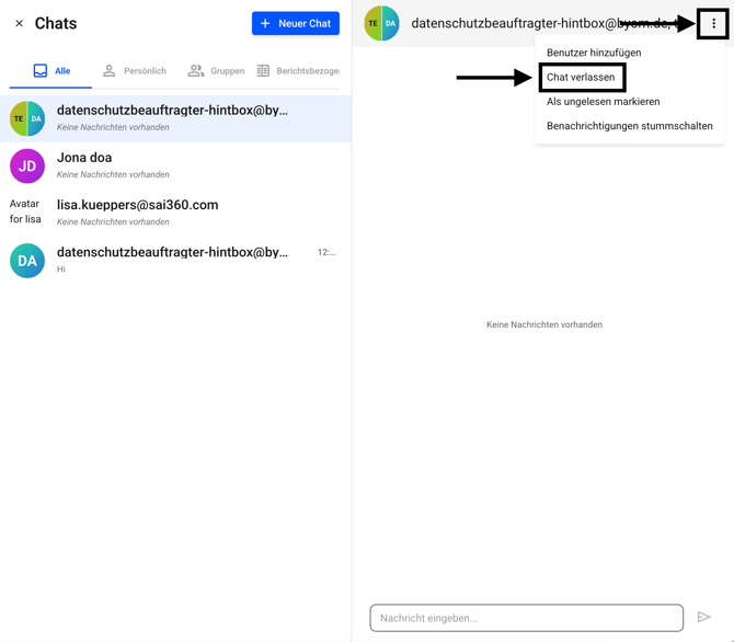 Klicken Sie auf die drei Punkte und anschließend auf Chat verlassen.