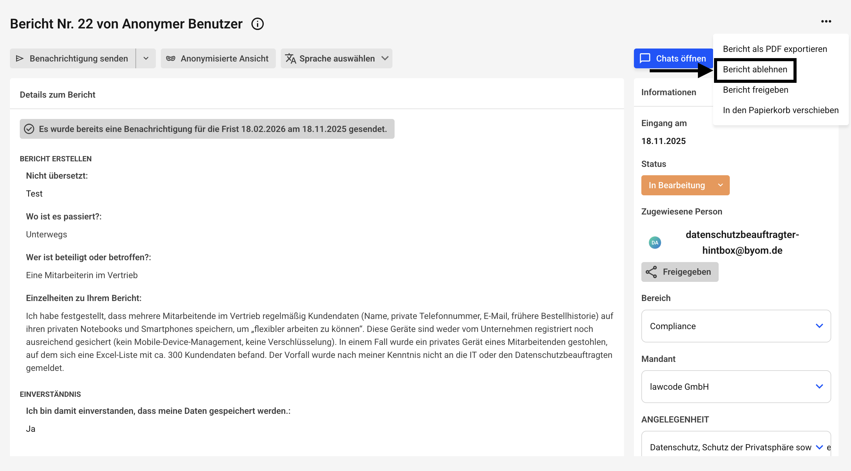 Im Auswahlfeld können Sie nun die Aktion “Bericht ablehnen“ anklicken.