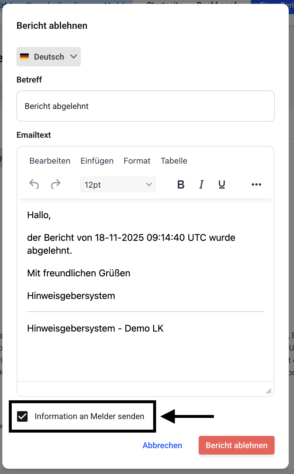 Wenn Sie den Haken bei “Information an Melder senden“ rausnehmen, dann wird der Texteditor wieder ausgeblendet, sodass Sie den Hinweis ohne Meldung an den Hinweisgeber ablehnen können.