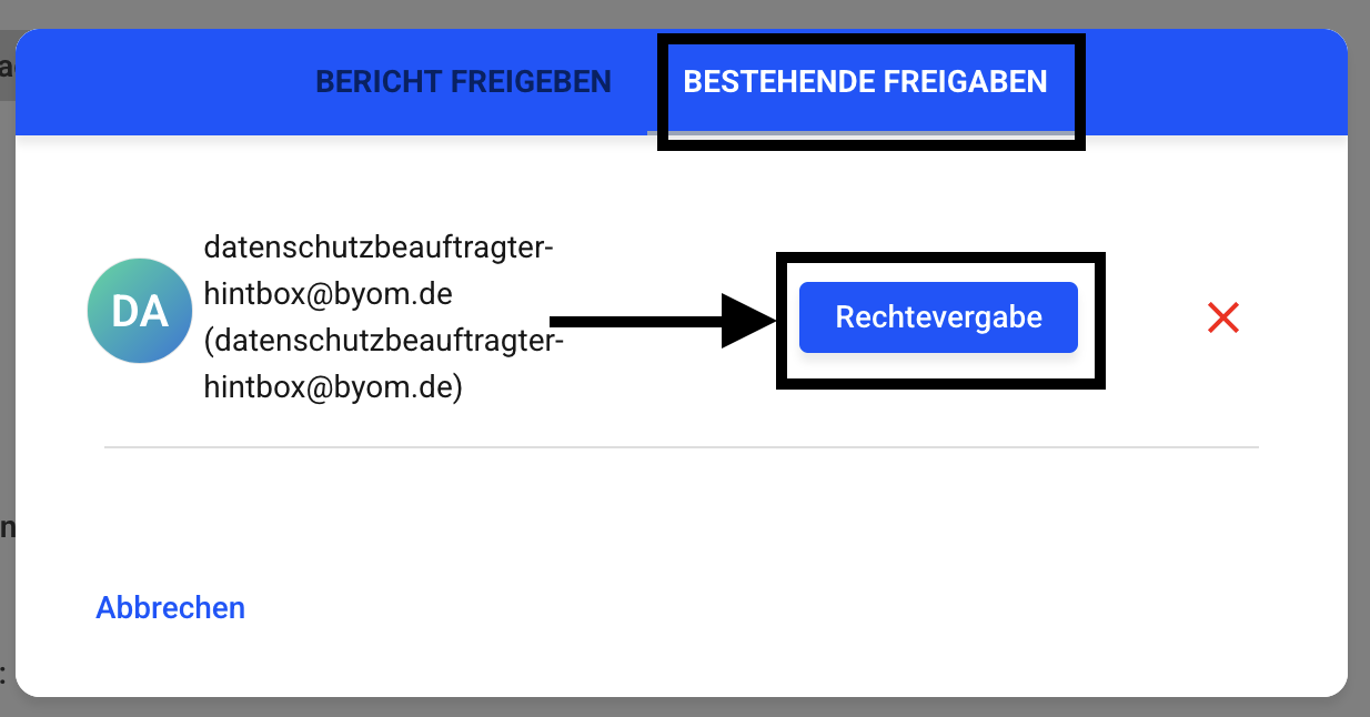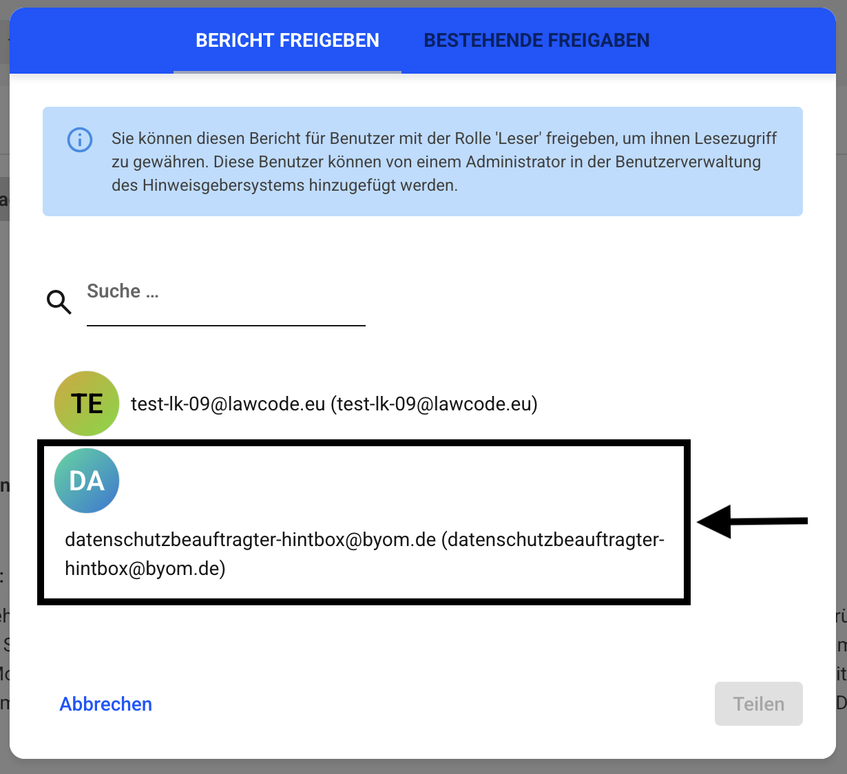 Der ausgewählte Benutzer wird grau hinterlegt, mit einem Klick auf Teilen können Sie nun gezielt den einzelnen Bericht dem ausgewählten Bericht freigeben.