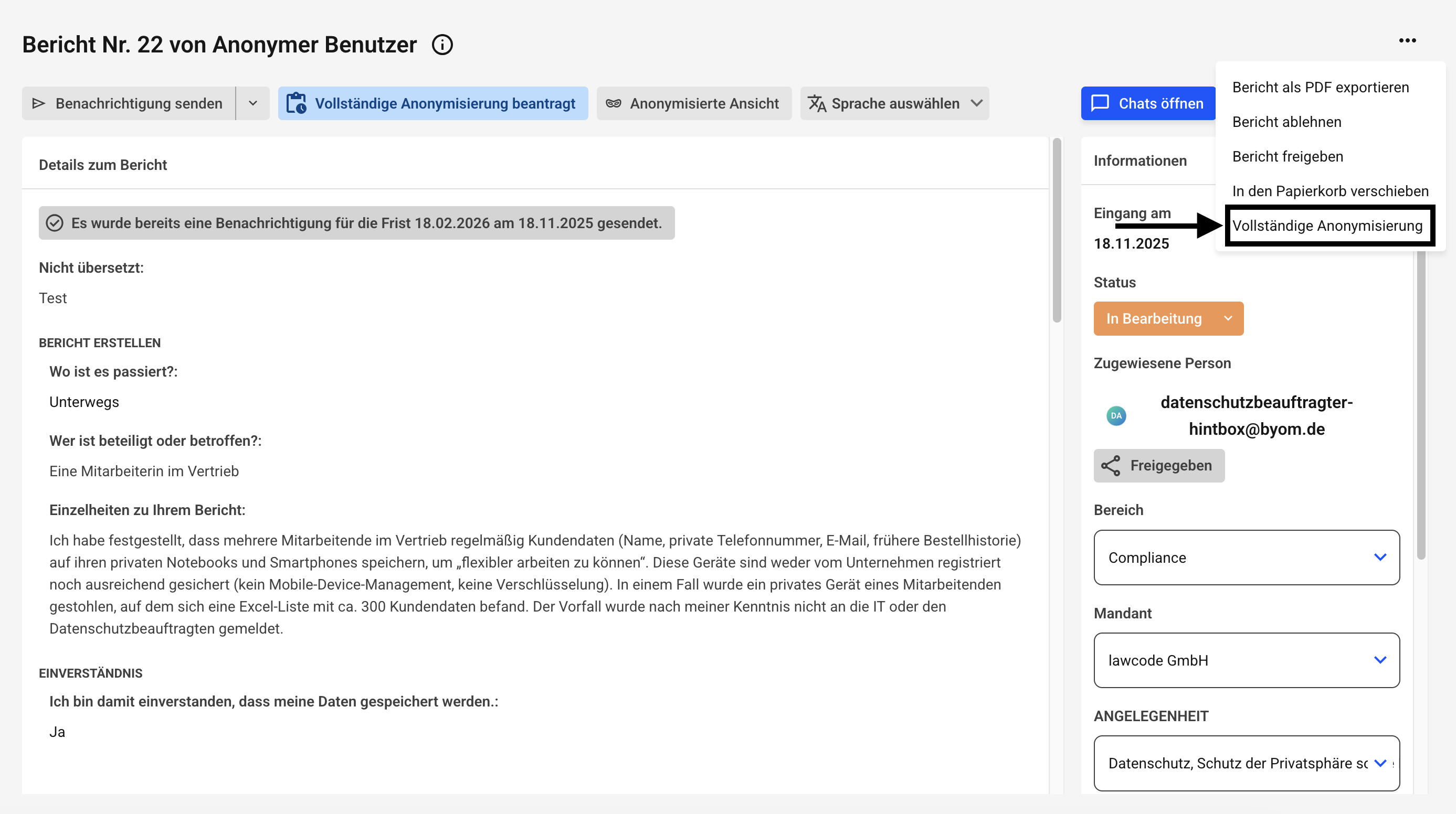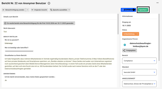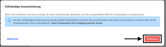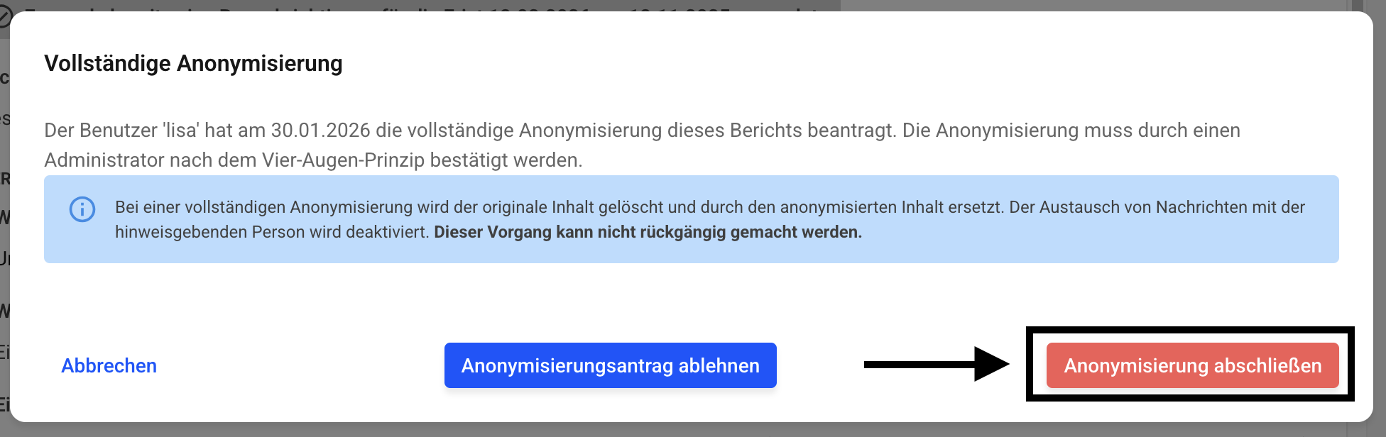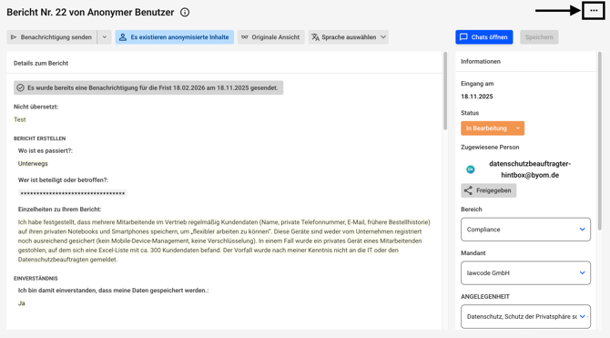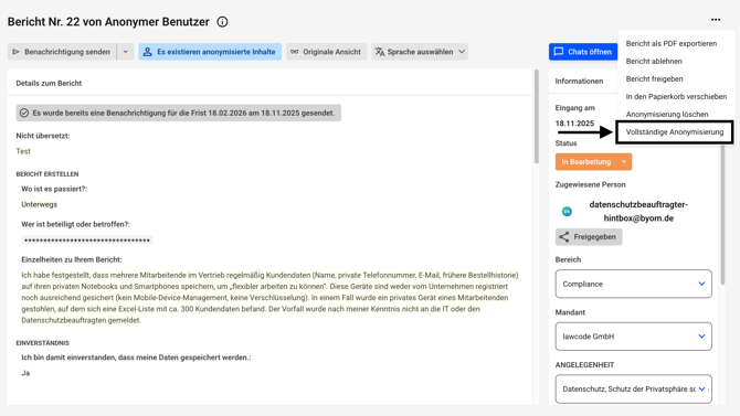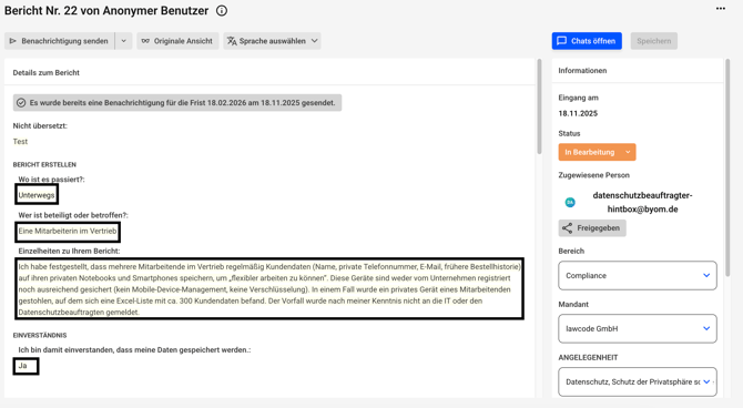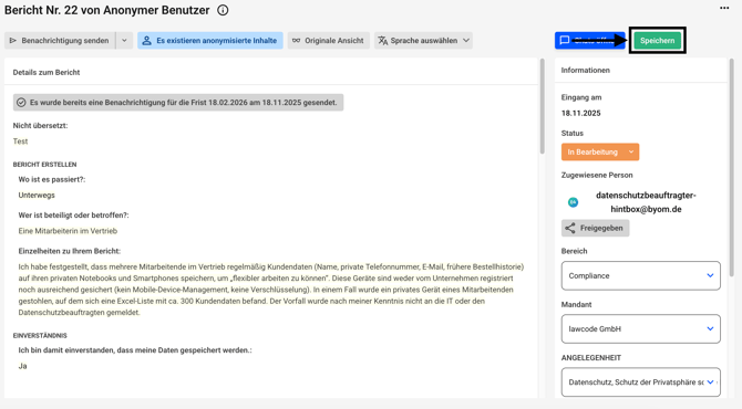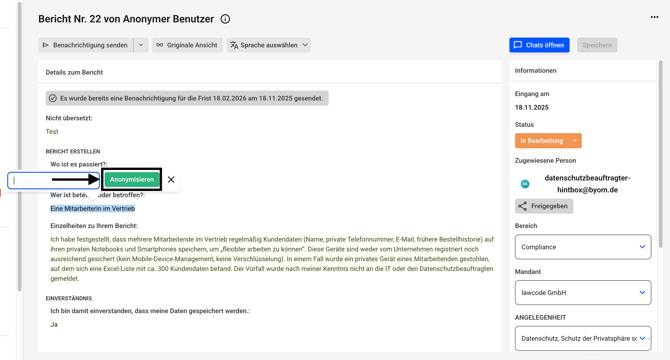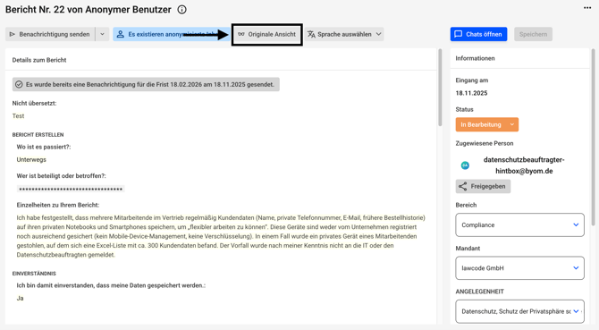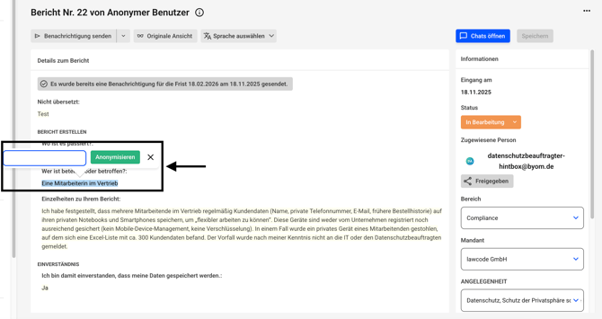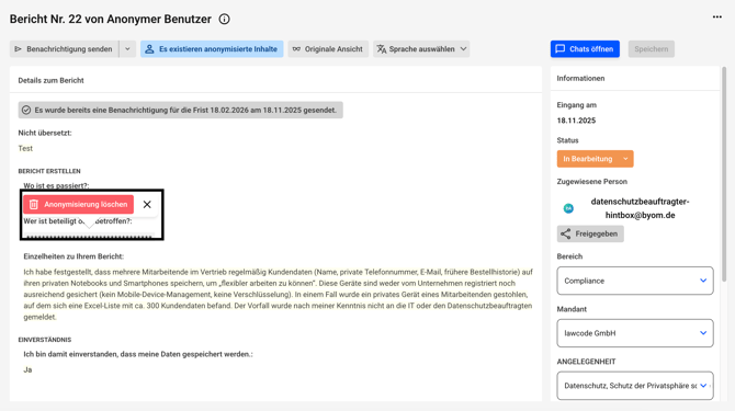 Es kann dann nicht mehr zwischen der anonymen und der originalen Ansicht eines Hinweises gewechselt werden. Die anonymisierten Inhalte sind unwiderruflich geschwärzt. Die Anonymisierung muss durch einen anderen Administrator nach dem Vier-Augen-Prinzip bestätigt werden.