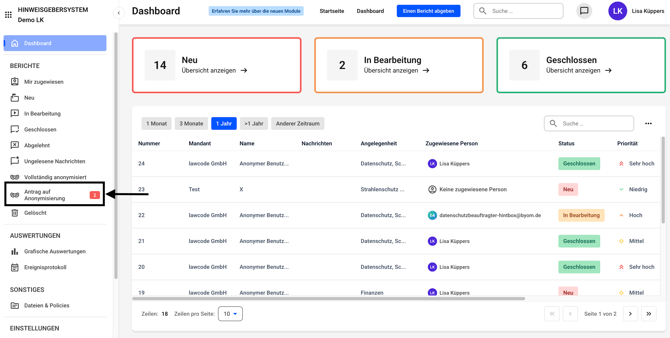 Ein anderer Admin muss den Antrag genehmigen. (Hier ist jetzt ein anderer Administrator angemeldet). Im Dashboard kann auf Antrag Anonymisierung geklickt werden.