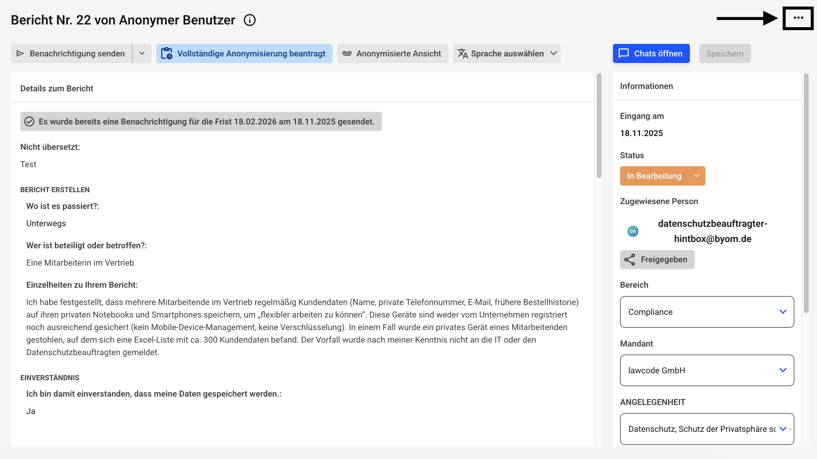 Mit einem Klick auf das markierte Symbol, können Sie zur anonymisierten Ansicht wechseln und Inhalte des Berichtes anonymisieren.