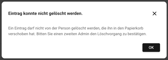 Die Person, die den Löschantrag gestellt hat, kann den Hinweis nicht final löschen. Sie wird eine nachfolgende Fehlermeldung erhalten.