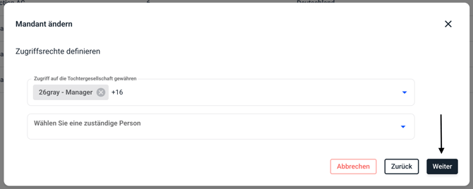 Ebenso können Sie die zuständige Person verändern. Sobald Sie Ihre Auswahl getroffen haben, können Sie dies auf Weiter bestätigen.