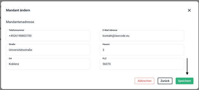 Auf der letzten Seite der Mandantenbearbeitung können Sie die Kontaktdaten des Mandanten bearbeiten. Sobald Sie alle Daten wie gewünscht, geändert haben, können Sie dies auf Speichern bestätigen.