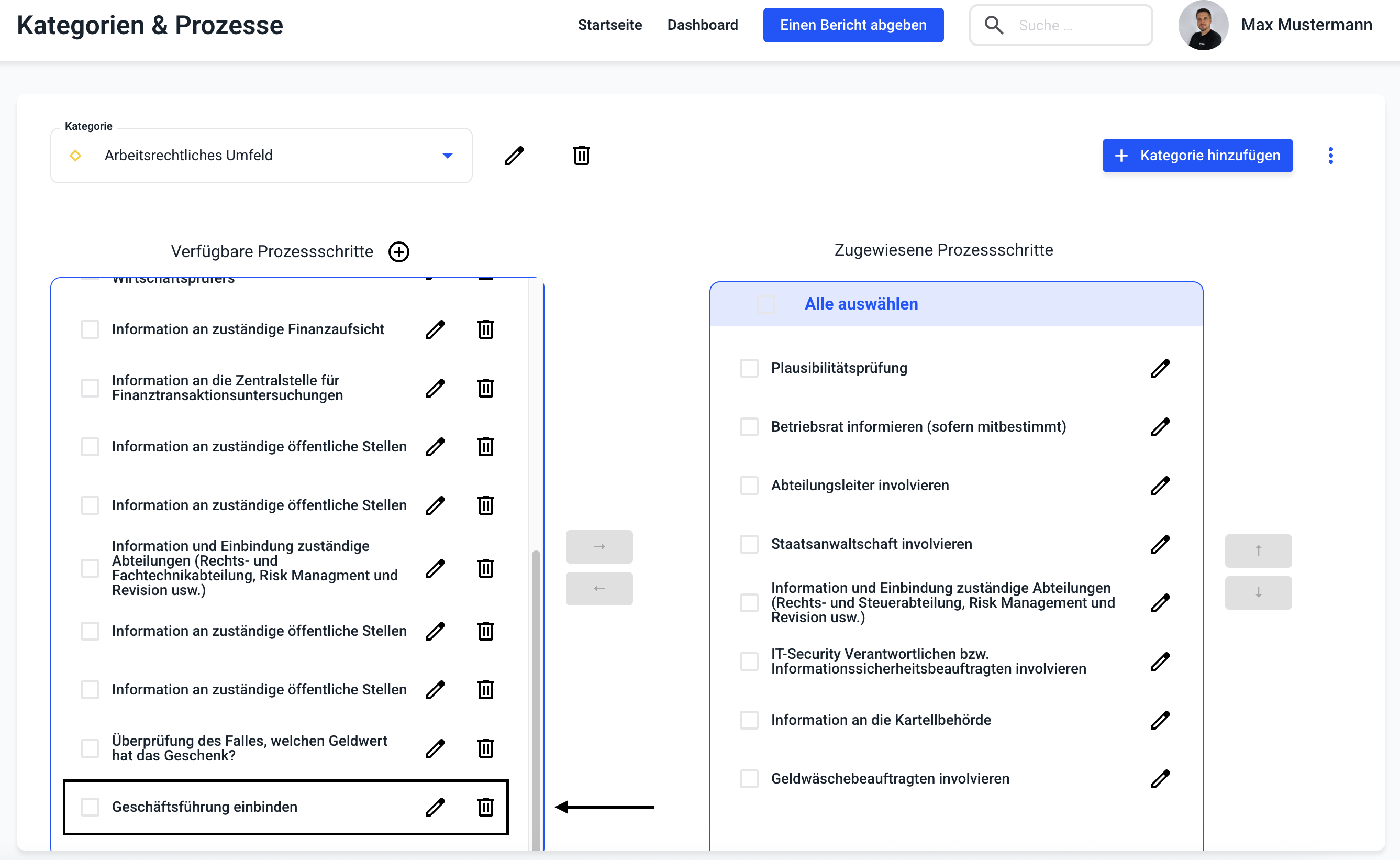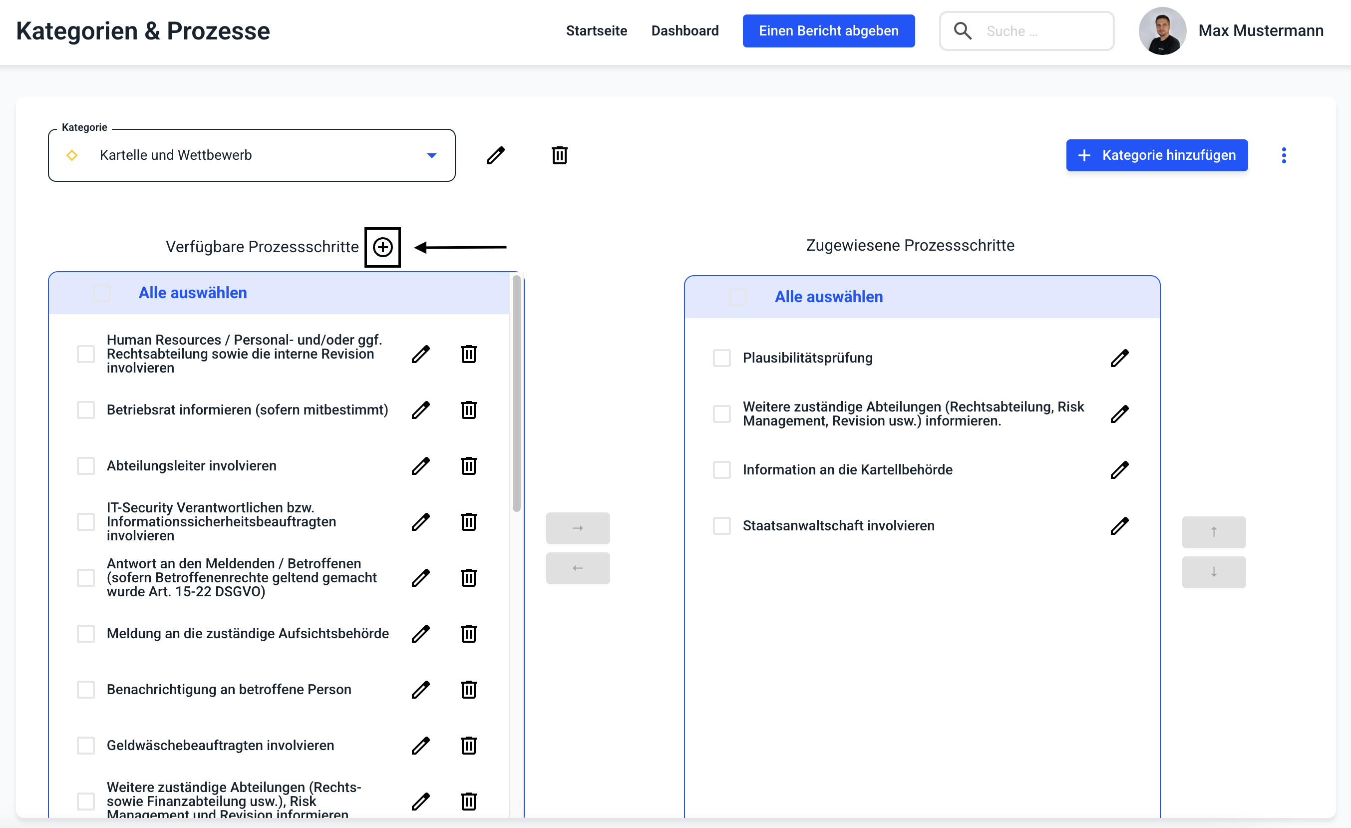 Der Prozessschritt kann anschließend für alle Kategorien unter verfügbare Prozessschritte ausgewählt werden.