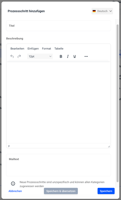 Ein Prozessschritt kann nachfolgende Elemente enthalten: Einen Titel, eine Beschreibung und einen Mailtext.