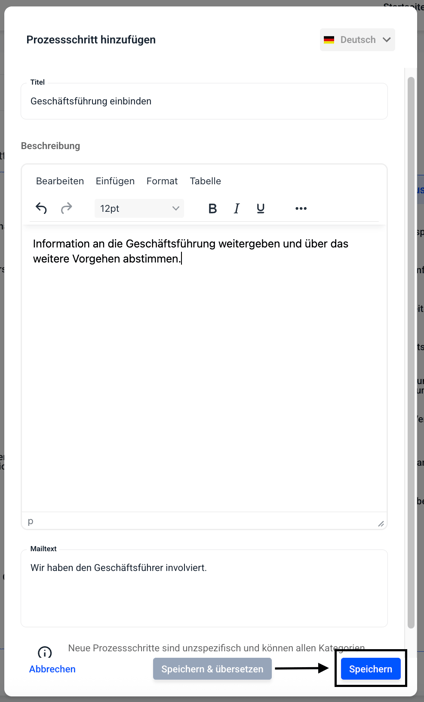 Nach Ausfüllen der drei Felder muss der Prozessschritt mit Klick auf Speichern gespeichert werden.