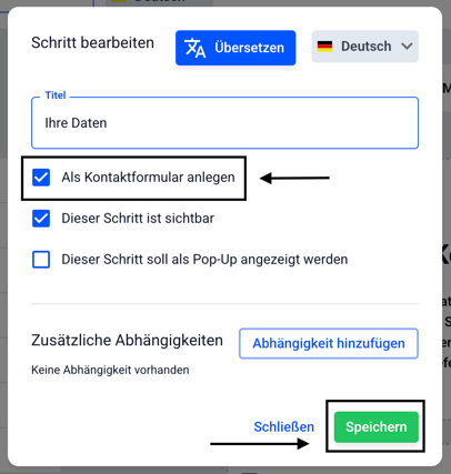 Erstellen Sie einen neuen Schritt oder bearbeiten Sie einen bereits bestehen Schritt. Klicken Sie die Checkbox "als Adressformular anlegen" an und bestätigen Sie dies mit dem Speichern-Button.