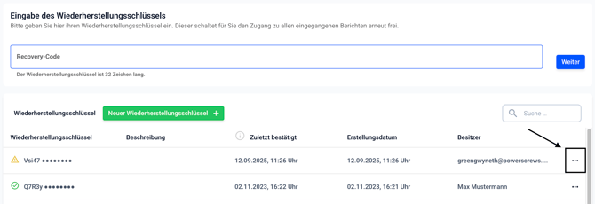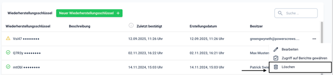 Zum Löschen eines Wiederherstellungsschlüssels klicken Sie auf die drei Punkte auf der rechten Seite.