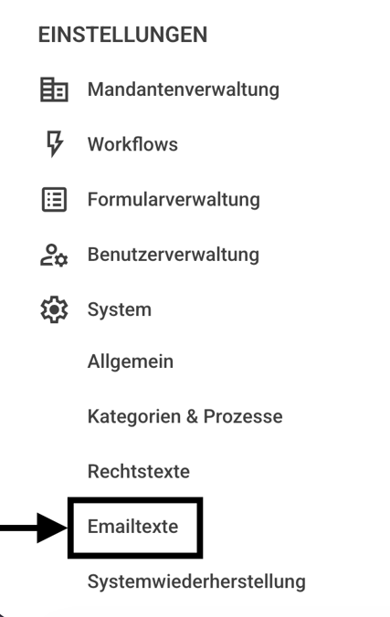 Um die Emailtexte zu bearbeiten klicken Sie unter Einstellungen → System → Emailtexte.