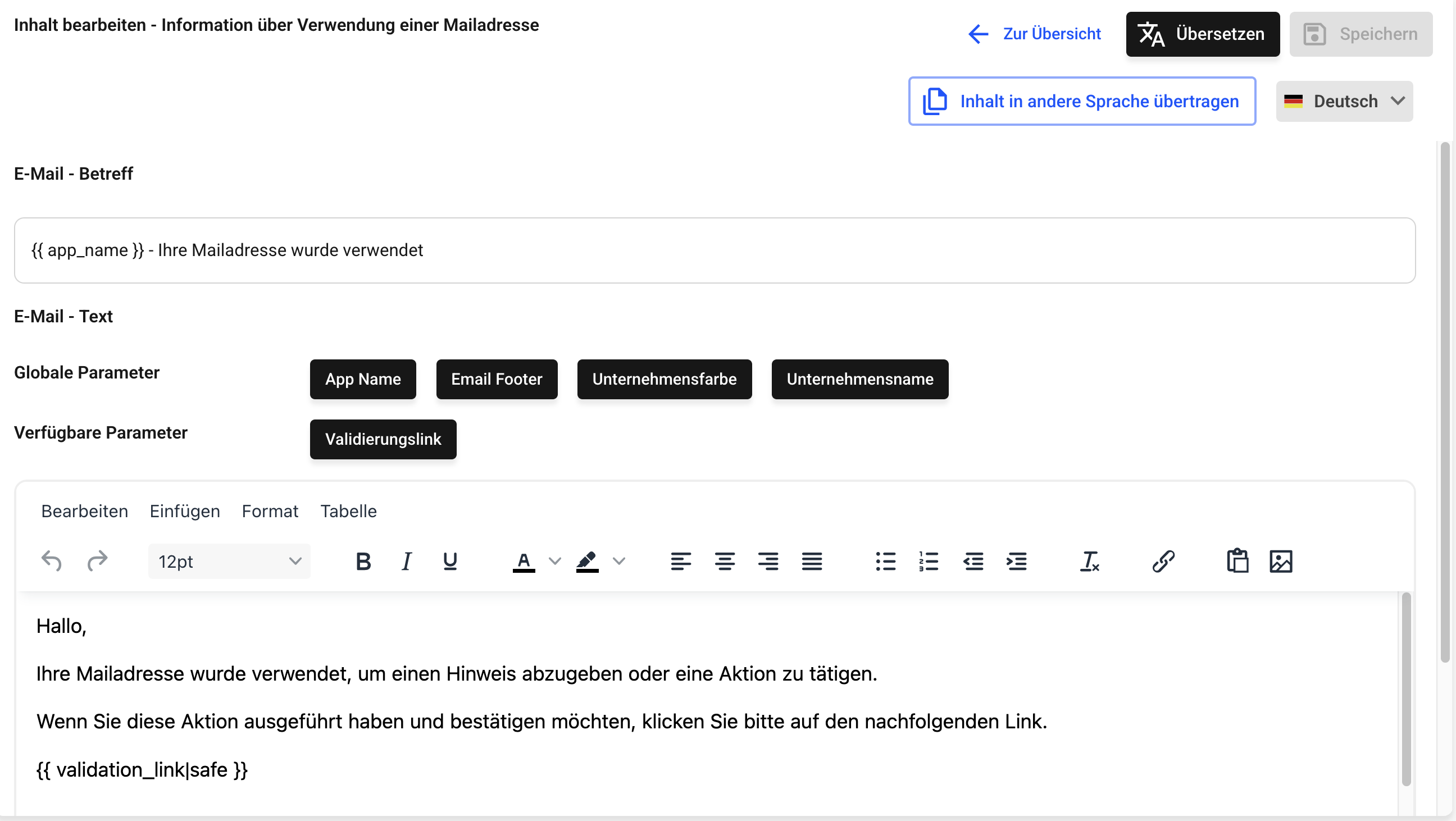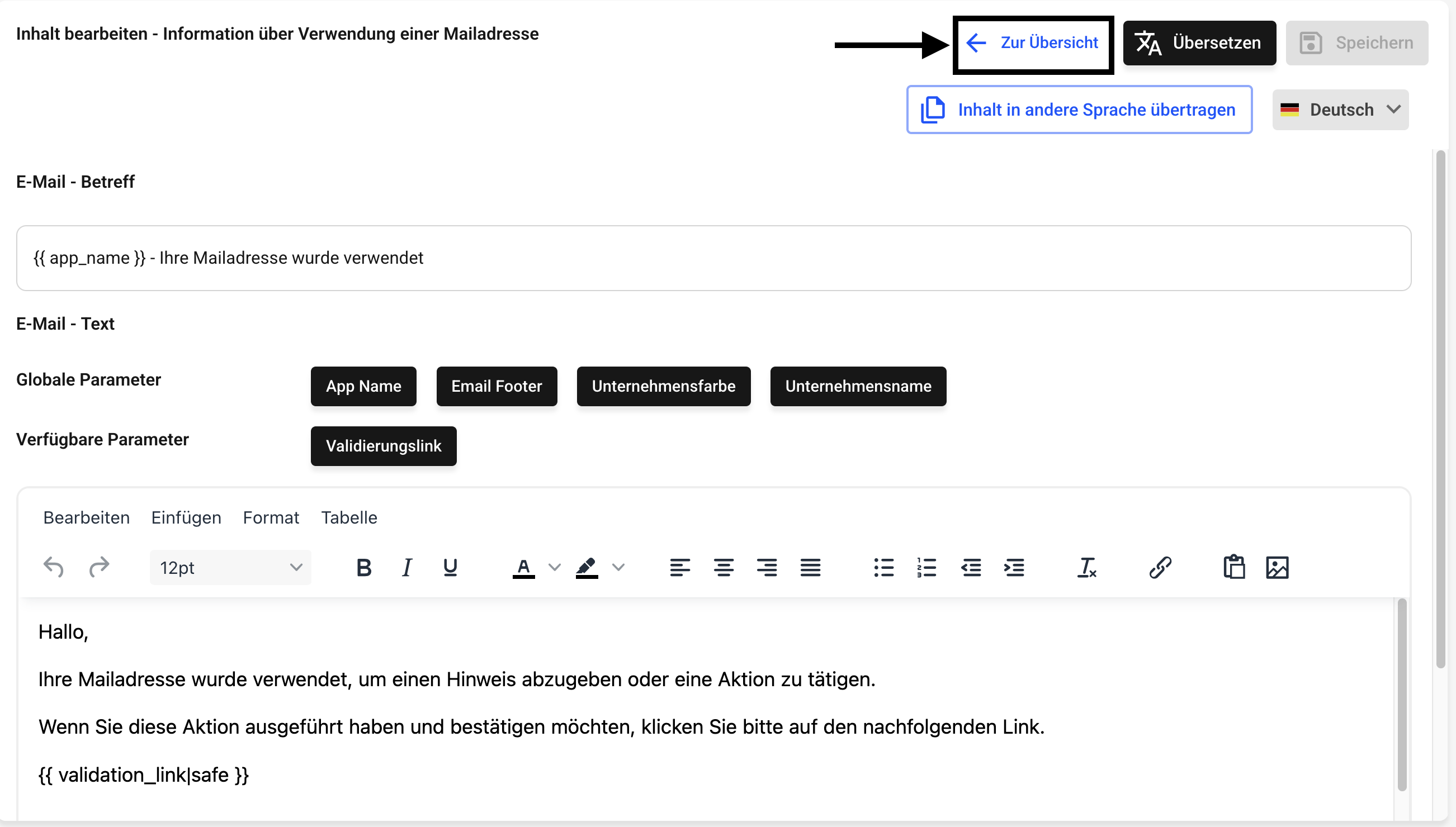 Über den Button Zur Übersicht gelangen Sie zu allen E-Mailtexten.