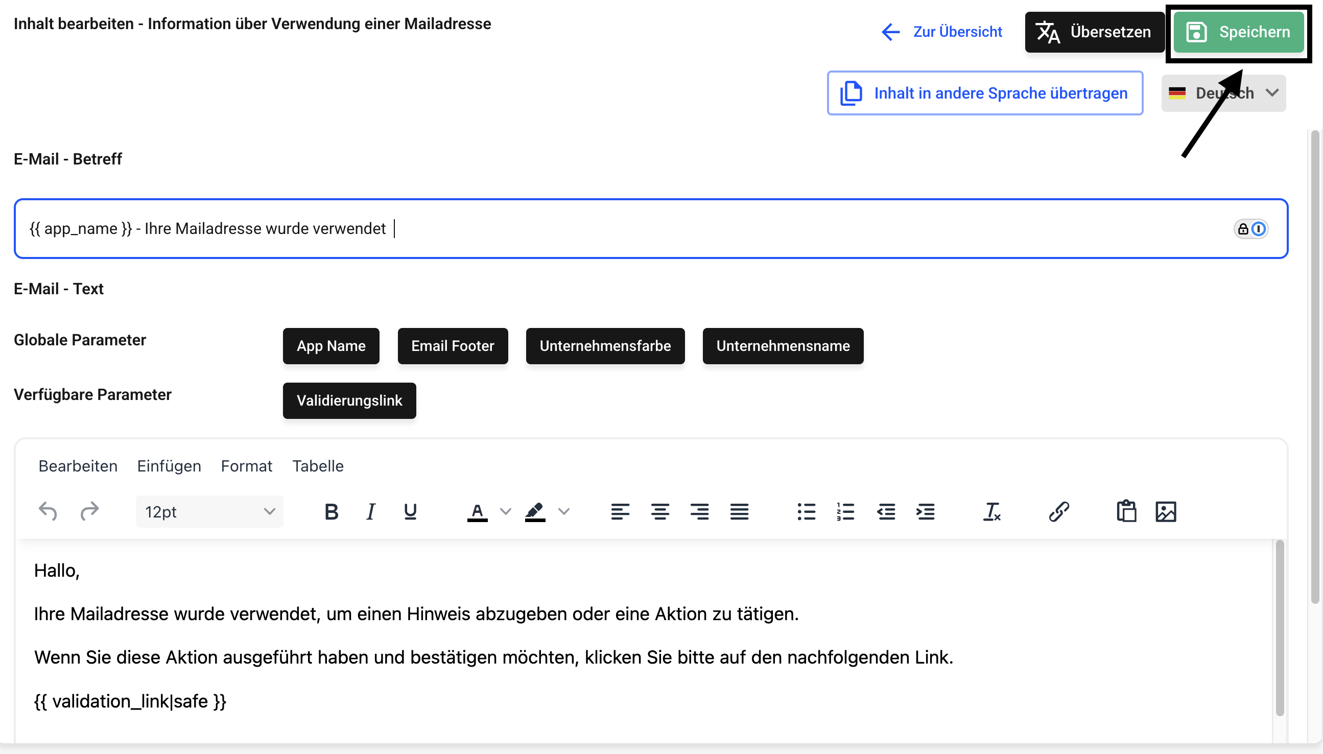 Anpassungen können mithilfe des Texteditors im Textfeld gemacht werden.