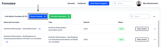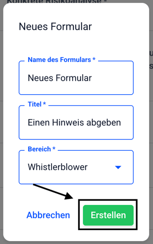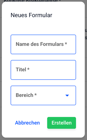Bereich: Jedes Formular kann einem Bereich zugeordnet werden. Der Bereich erscheint als Button auf der Startseite.