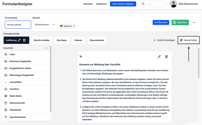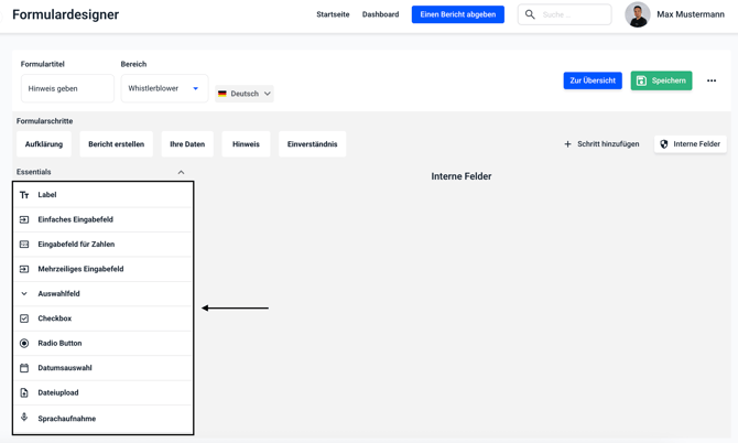 In der Felderauswahl gibt es verschiedene Felder, die Sie als interne Felder nutzen können. Klicken Sie auf das entsprechende Feld und ziehen dieses nach rechts in das Formular.