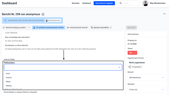 Sie haben die Möglichkeit die Fallbearbeitung nach eigenen Wünschen zu erweitern. Es können am Bericht verschiedene Felder hinzugefügt werden. Diese sind nur für die Bearbeiter sichtbar.