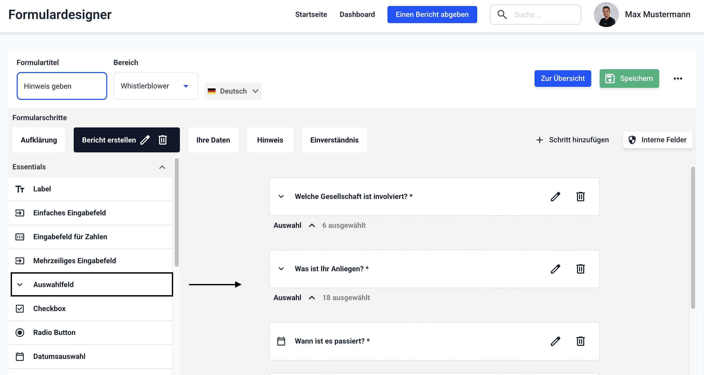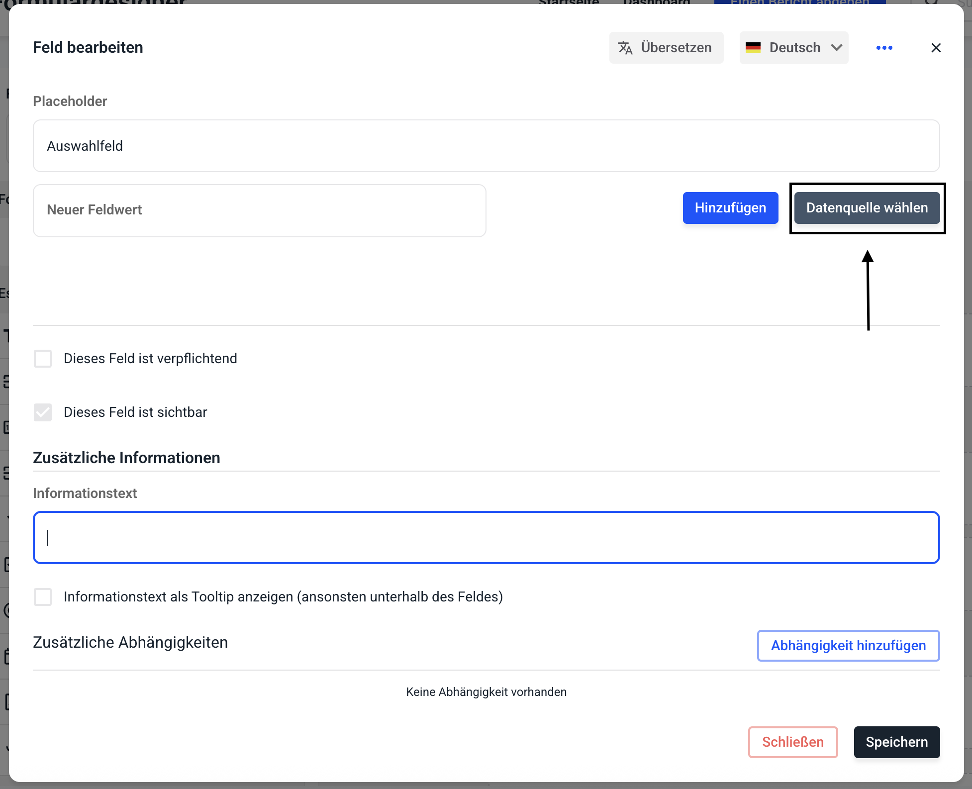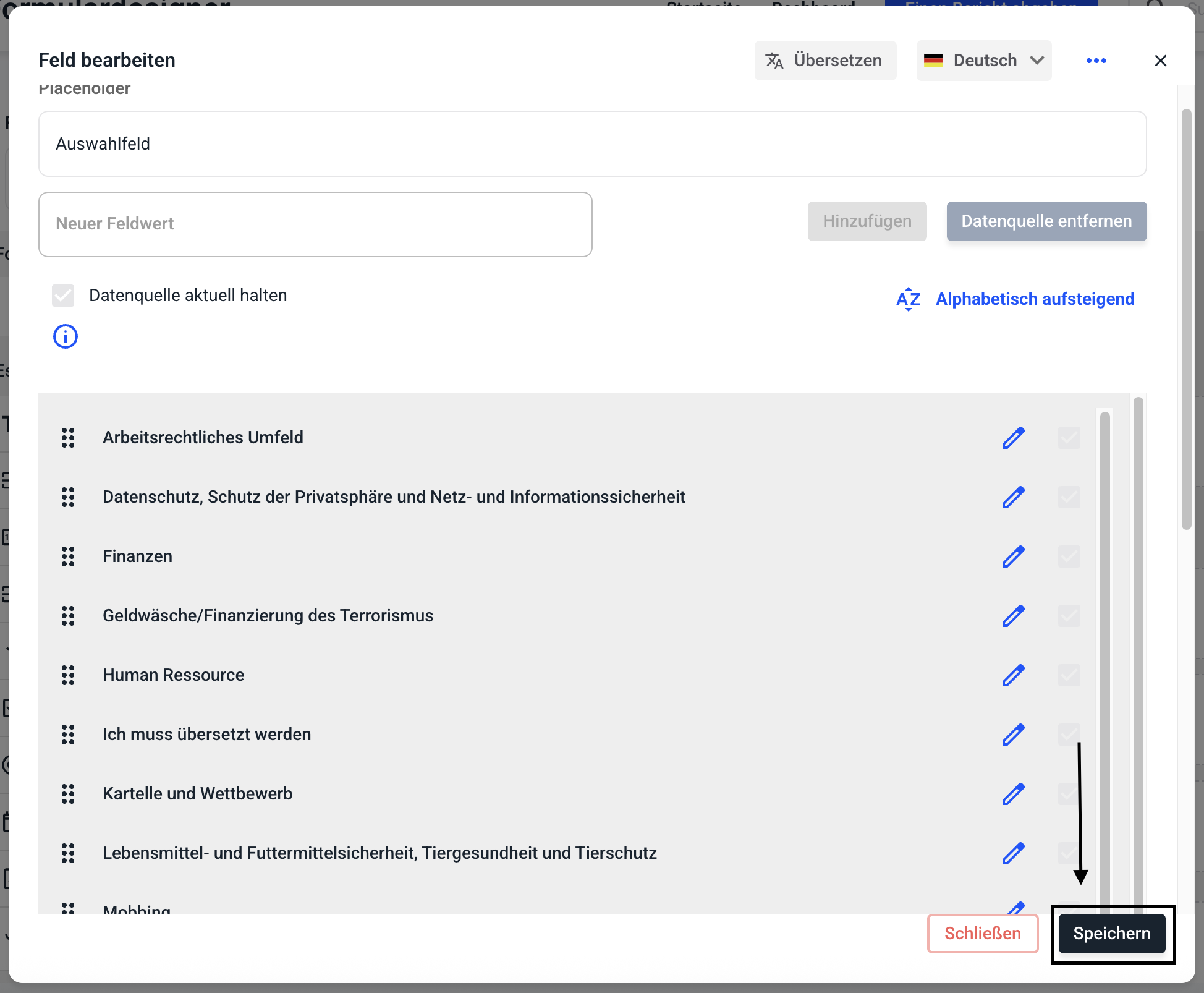 Die Datenquelle der Kategorien wurde nun hinzugefügt. Klicken Sie auf Speichern, um die Veränderung im Formular zu speichern.