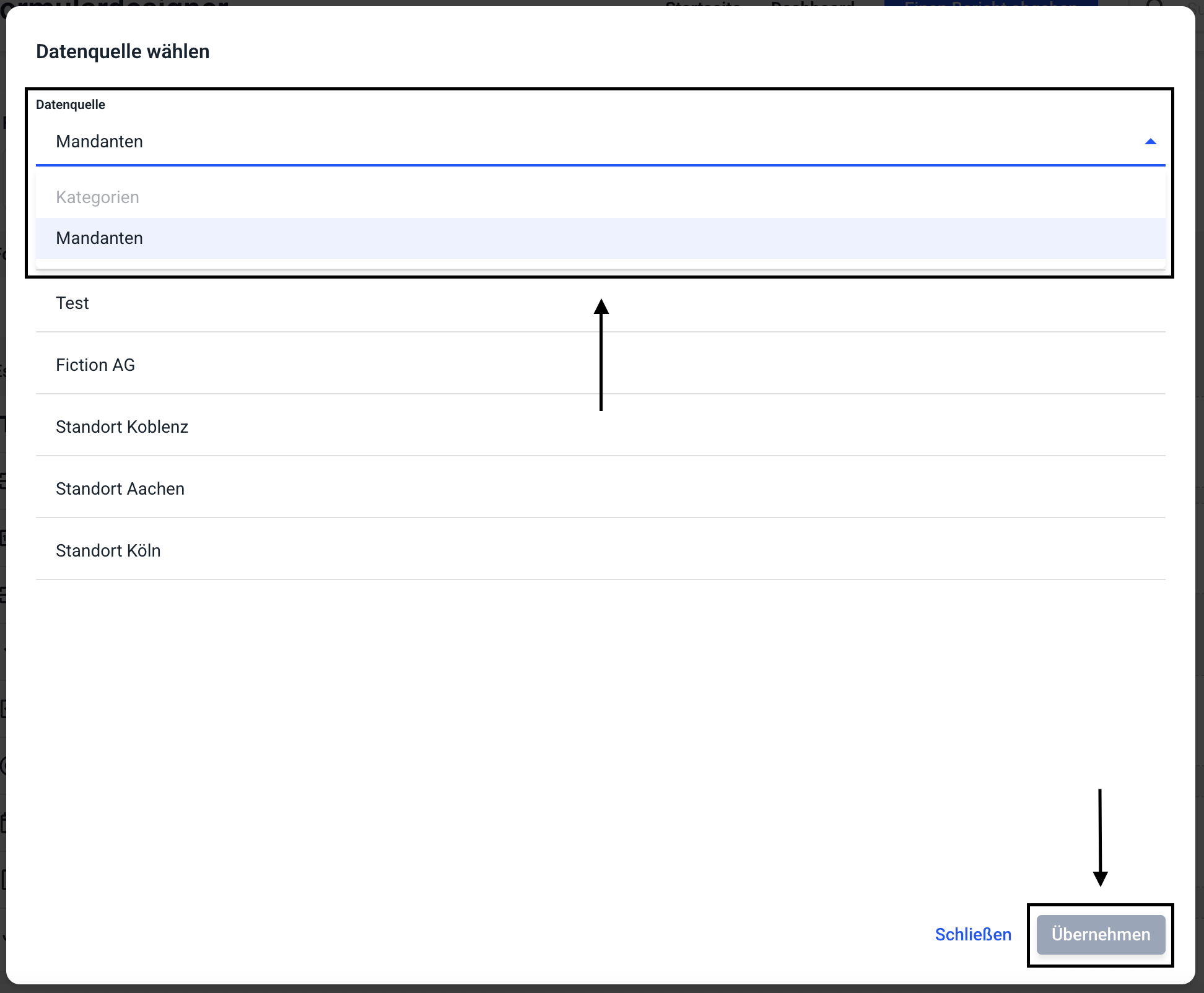Die Datenquelle der Mandanten ermöglicht Ihnen, jeden gewünschten Mandanten in Ihrem Formular zu übernehmen, und bei Änderungen in der Mandantenverwaltung die Mandanten im Formular aktuell zu halten.