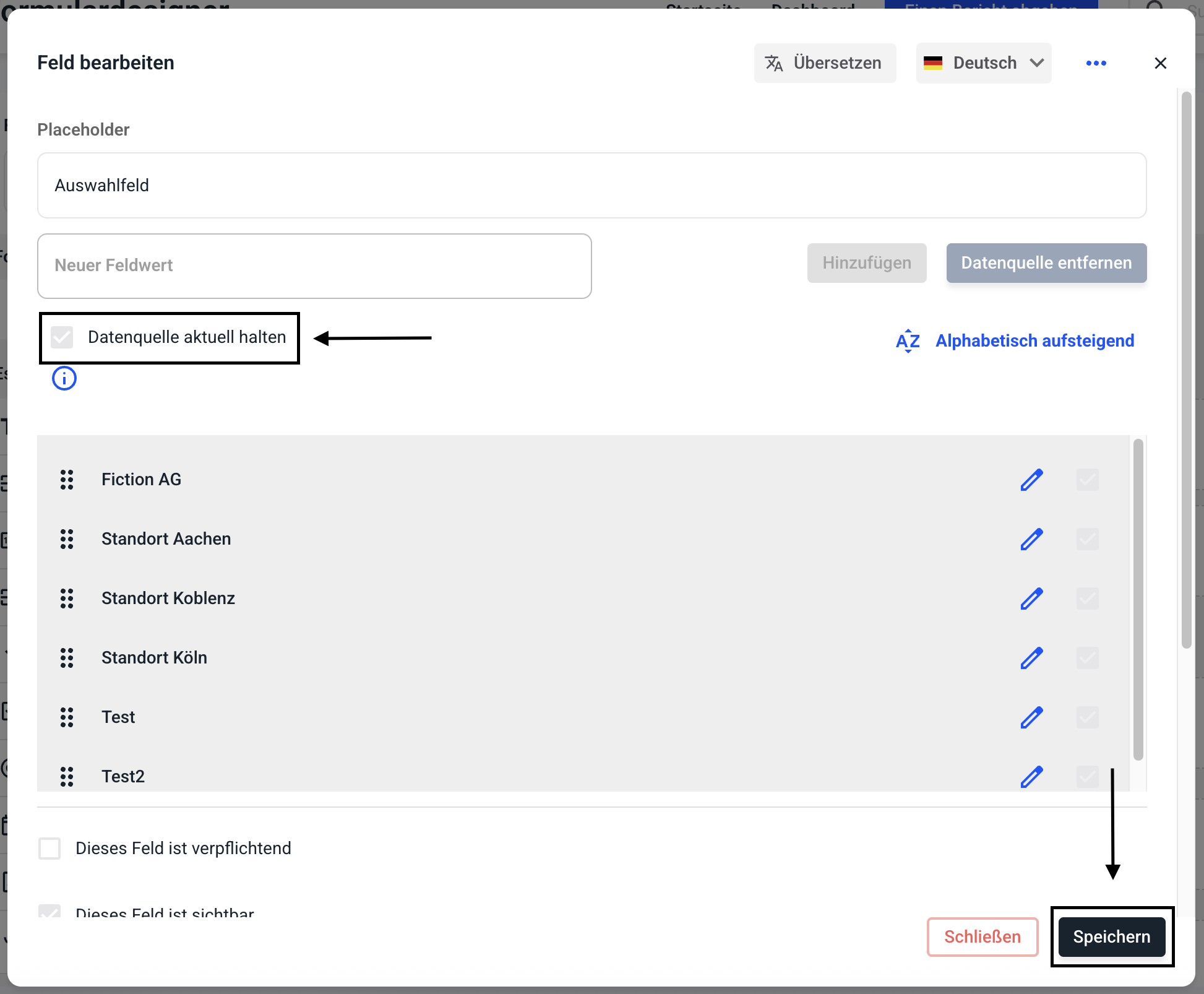 Die Mandanten wurden dem Auswahlfeld hinzugefügt. Um Veränderungen in der Mandantenverwaltung automatisch im Formular zu übernehmen, klicken Sie auf die Checkbox Datenquelle aktuell halten.