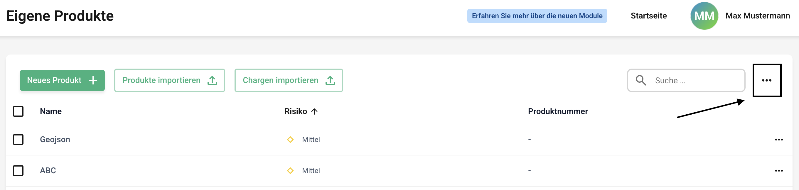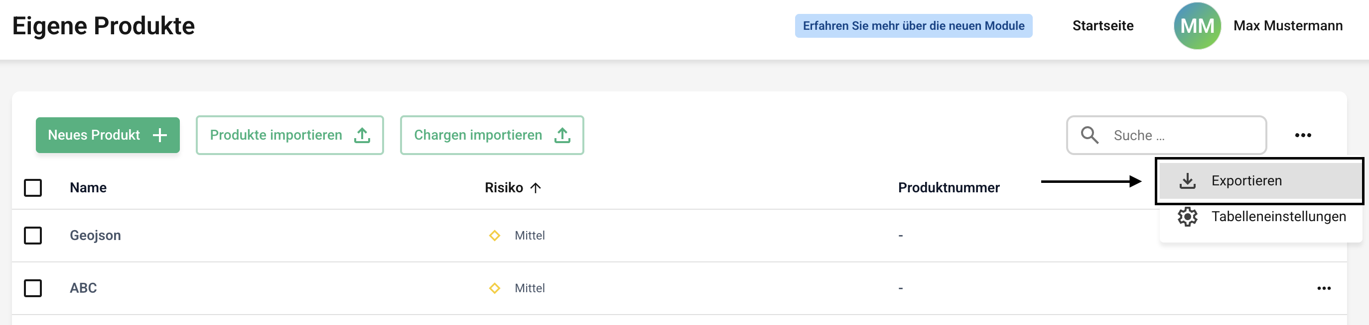 Um den Export für Ihre Produkte durchzuführen, klicken Sie zunächst auf die Eigenen Produkte oder die Lieferantenprodukte.