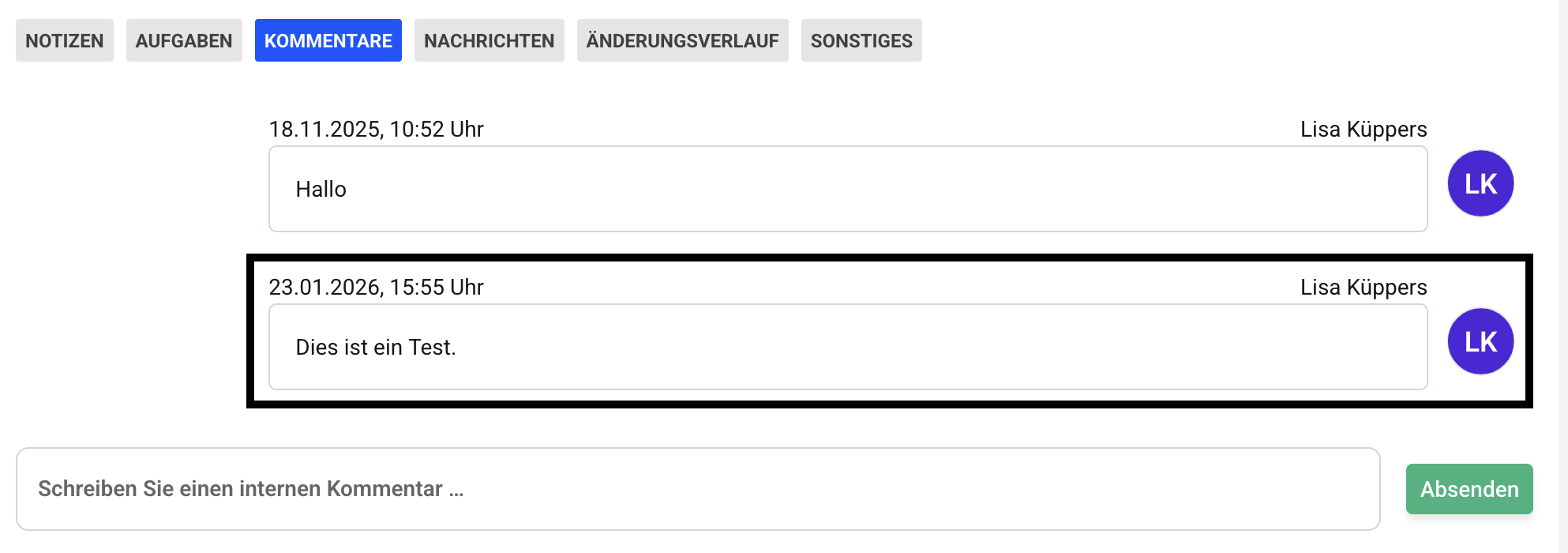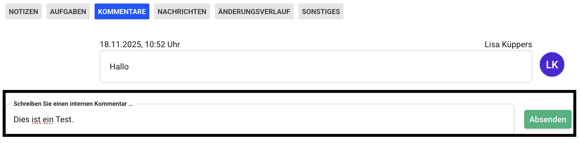 Nutzen Sie dazu die Textzeile dort schreiben Sie Ihren gewünschten Satz rein und bestätigen diesen mit dem Button “Absenden“. Sobald dieser Kommetnar abgesendet wurde, kann jeder Fallbearbeiter mit Zugriff auf den Hinweis diesen Kommentar einsehen.