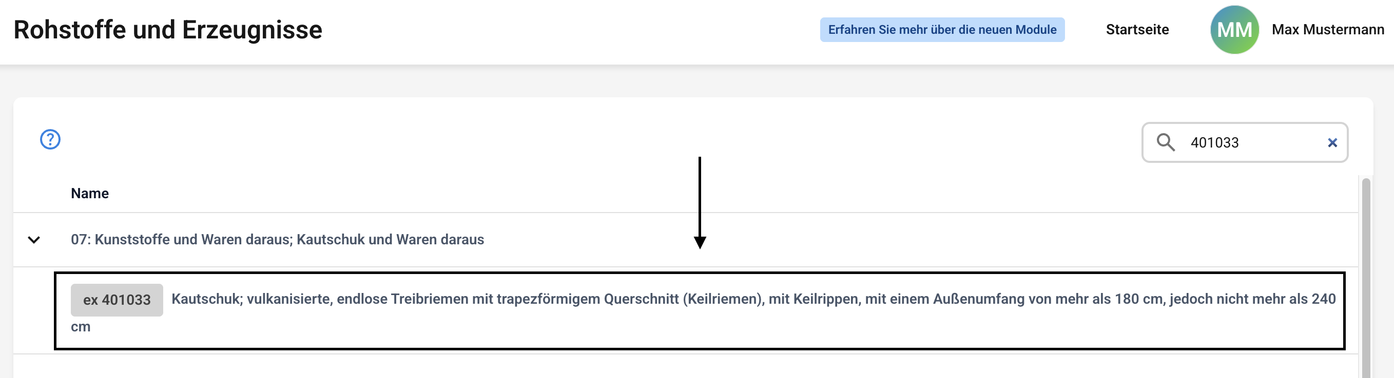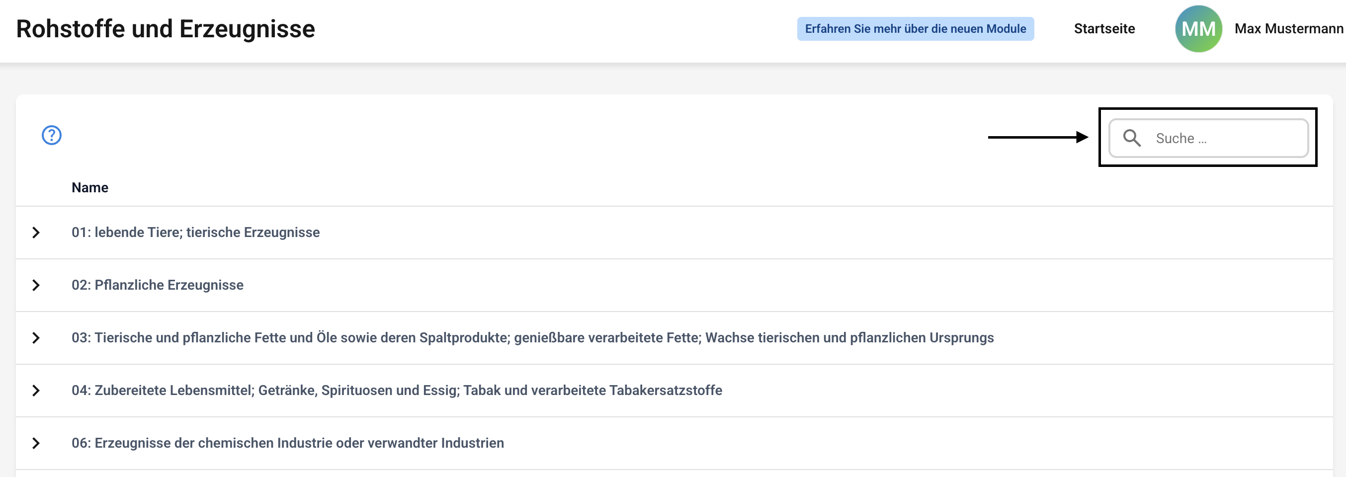 In diesem Kapitel wird Ihnen erklärt, wie Sie nach einem Rohstoff oder einem HS-Code suchen können.