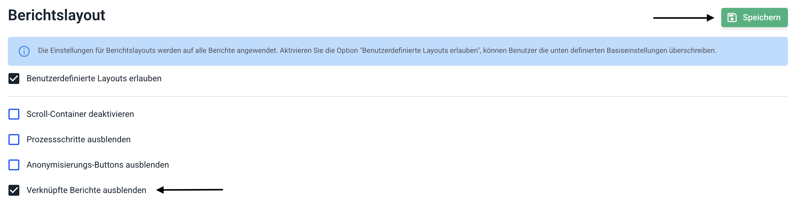 Für eine dauerhafte Deaktivierung setzen Sie den Haken bei verknüpfte Berichte ausblenden. Standardmäßig ist die Berichtsverknüpfung aktiviert. Klicken Sie anschließend auf Speichern, um die Änderungen zu übernehmen.