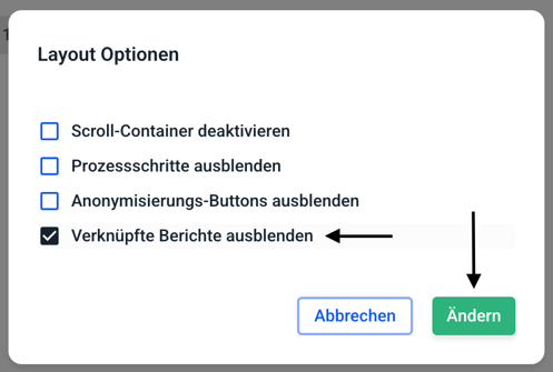 Wenn Sie die verknüpften Berichte ausblenden möchten, setzen Sie den Haken bei der Checkbox von Verknüpfte Berichte ausblenden. Wenn Sie die Verknüpften Berichte einblenden möchten, entfernen Sie den Haken. Bestätigen Sie dies im Anschluss mit Ändern.